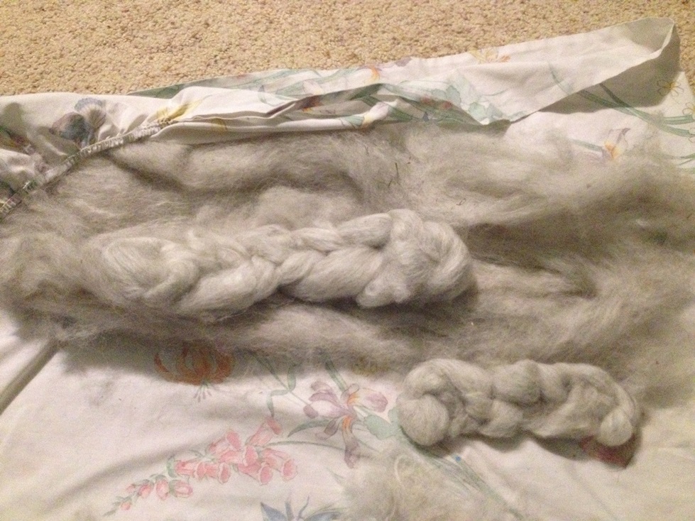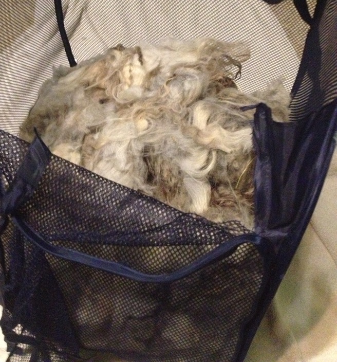 I’m also bringing a batch of washed fleece. This is stuff my friend washed while I was using her picker and drum carder on the neck fluff that I had washed previously It has not been picked or carded and still has vegetable matter in it.