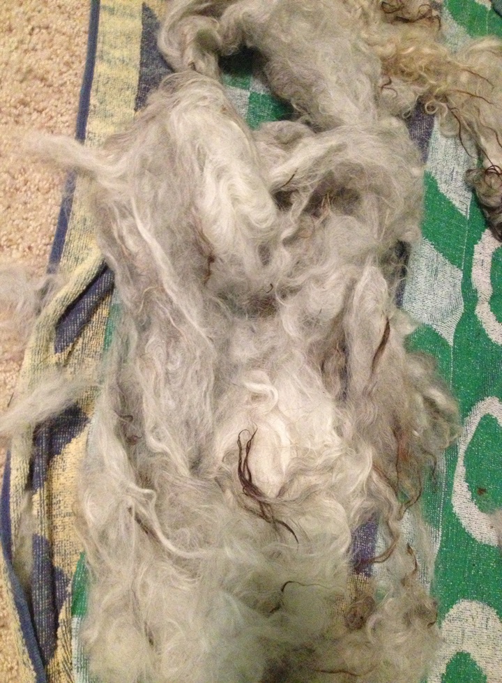 The raw fleece is wool as it comes off the sheep. It’s a little dirty, with bits of hay, grass, leaves and other vegetable matter embedded in the fibers. These strands of fiber are very grabby and they hold on to everything. I tried to be very selective about not shearing anything with droppings or other nasty stuff until I had the good stuff bundled off to the side. Even without washing this stuff only has a very little bit of sheep smell to it.