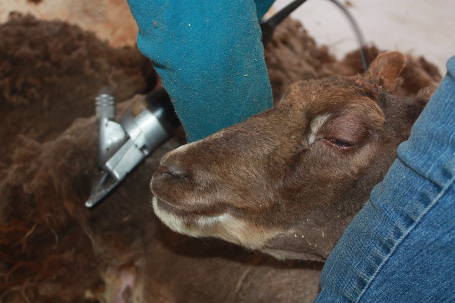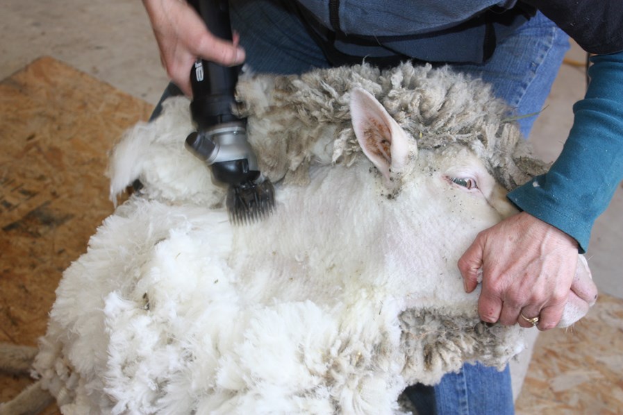 The shearer stretches Betty’s head to the side to smooth all the skin on her neck