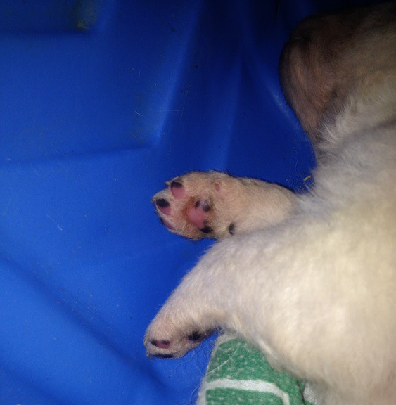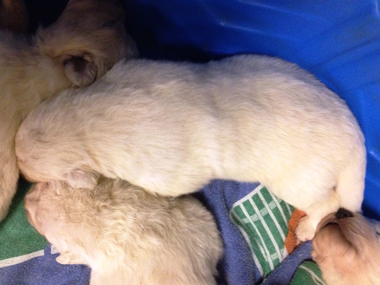 The puppies are officially one week old now and subtle differences are starting to appear. Some are bigger, they range in weight now from 1 lb 14 oz all the way to 2 lbs 12 oz, their coats are changing, and their pads and noses have begun to fade to black.
