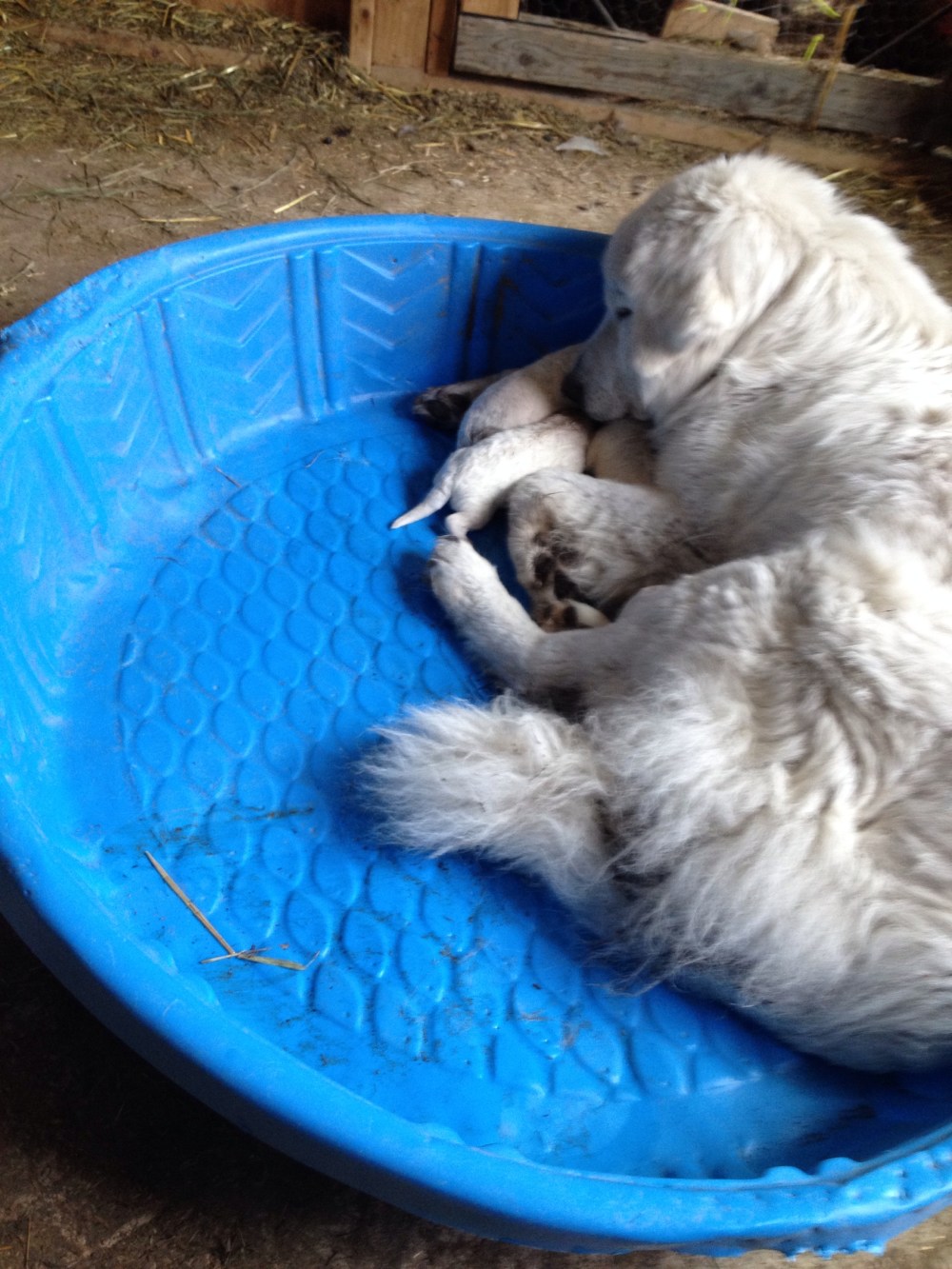 We moved the puppies and Mia into the part of the barn the sheep and lambs had just vacated. She looked relieved to see her swimming pool we use as a welping box. And immediately began checking and washing pups as I set them in.