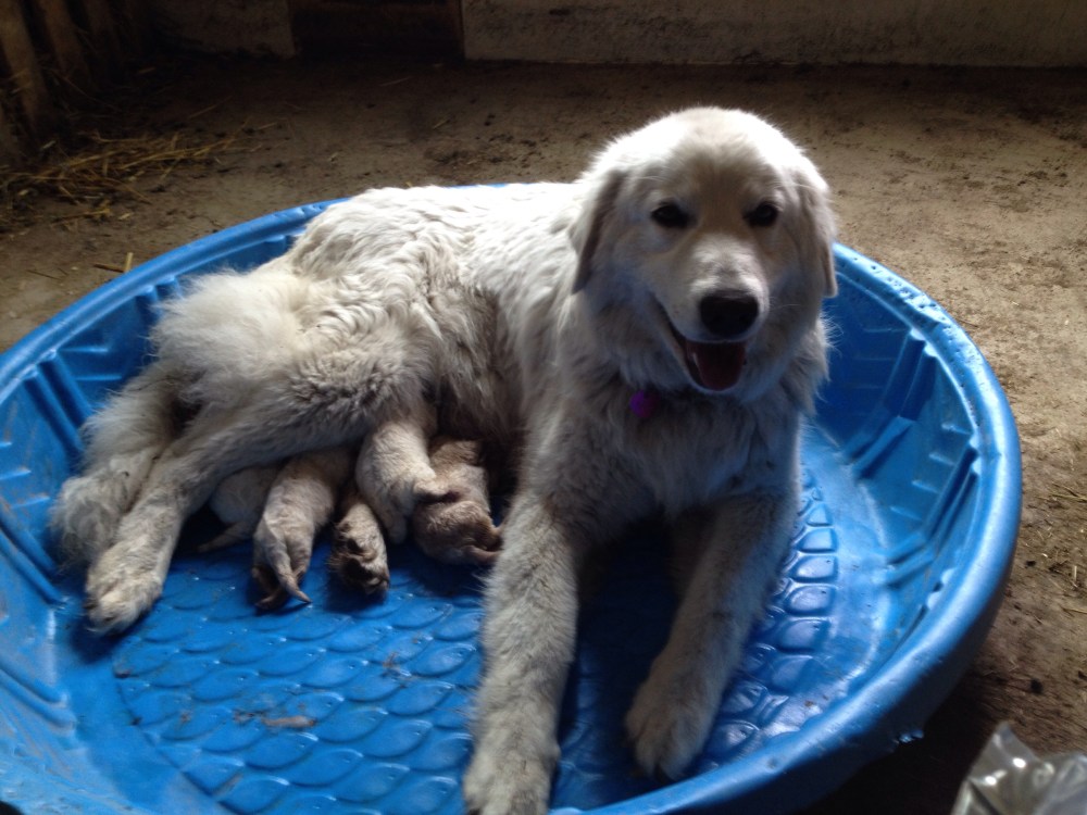 Mia usually gets locked in a private area of the barn when she welps. She does not like Al or anyone else getting close to the babies. The only part of the barn she had access to yesterday was not private enough, all the dogs have access to it. So she chose a more private location, under a box, out in the pasture.