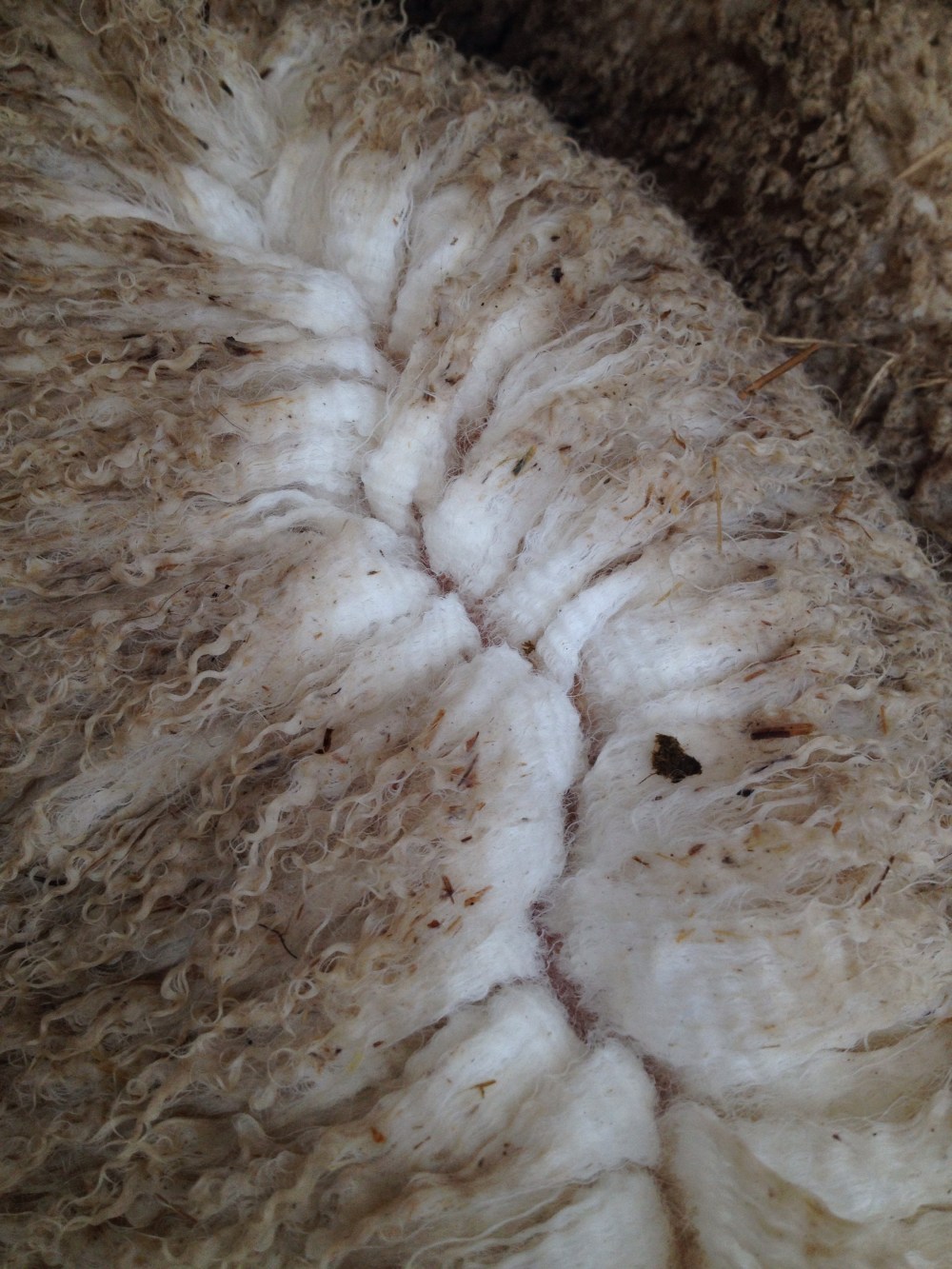 2 month old Miss Bridgett got so wet her fleece laid open down her spine so I got to see the wonderful crimp she is producing.