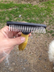Al will typically let me brush him for about 2 minutes and then he wants to go. So I work fast but very gently. If the hair doesn’t want to come out I’m not gonna force it. Yes he looks lopsided and a little disheveled for a week while we work our way along his body. So what. The sheep don’t care what he looks like as long as he prevents intruders. I enjoy my brief bouts of brushing as I don’t get sore from prolonged bending. Win-win