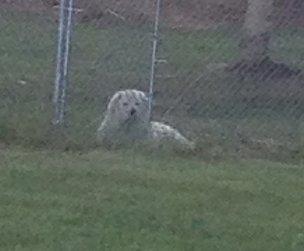 The white blob at the fence is Al. He was beside himself. There were chickens, HIS chickens, outside the fence. Ok,sure, they were in a cage but how could he protect them if they were waaaay over there? The big goofball just stayed right by the fence and stared at them.