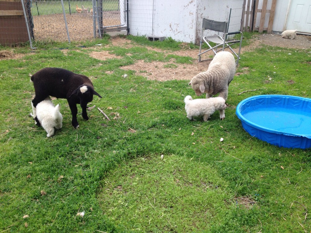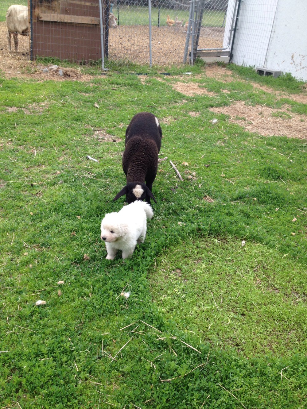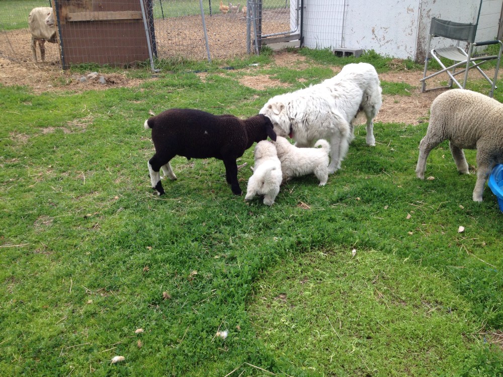 The lambs are used to the big white dogs but these new little furballs is something to be investigated.