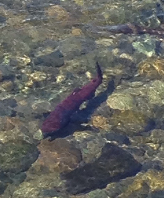 The first part of the day was productive at work, then sunny and warm while we were out doing afternoon site visits. My day job includes floodplain management which means I have to pay attention to creeks, rivers, and bridges. While checking one particulat bridge we spotted a king resting before battling his way upstream.