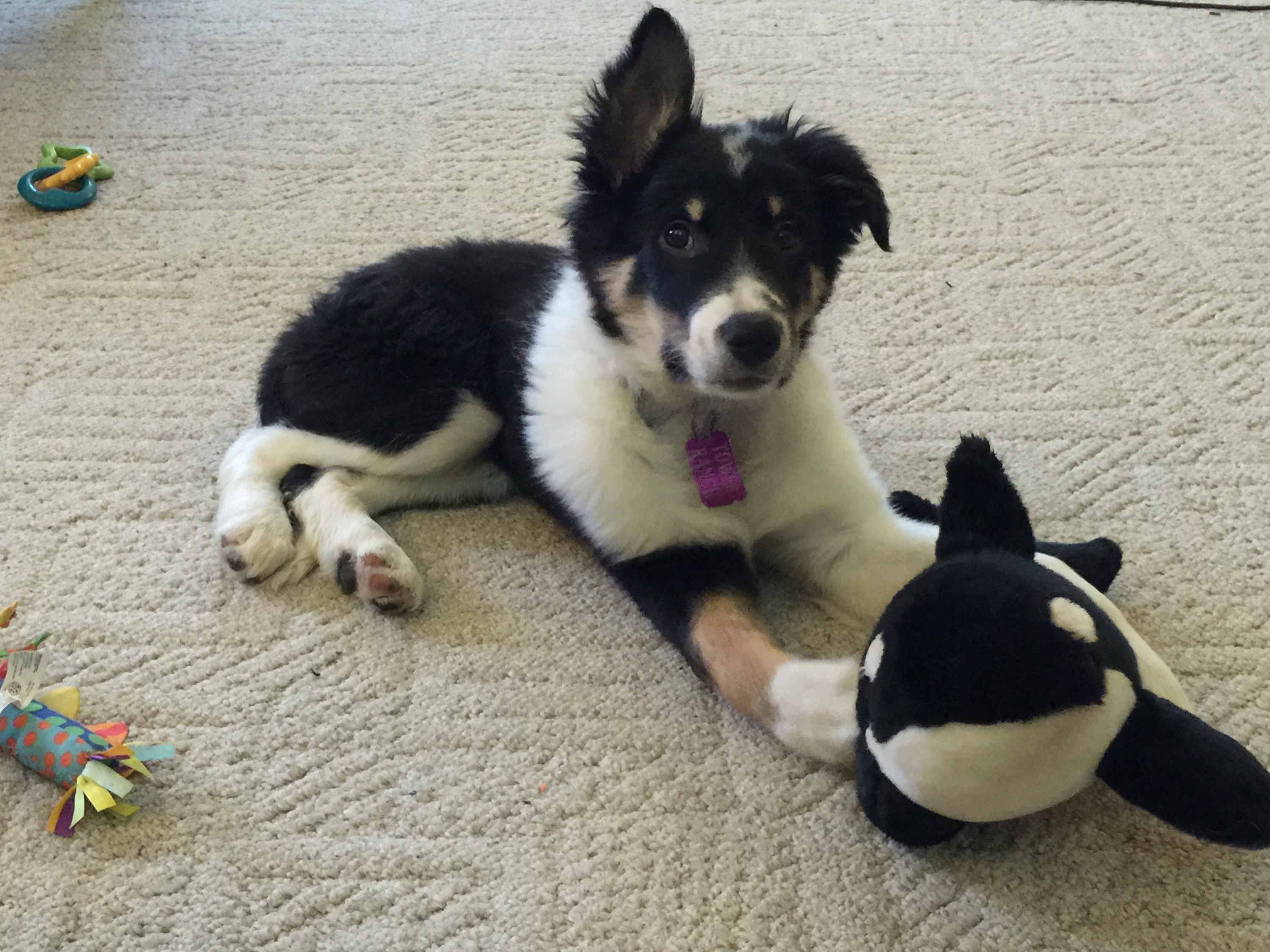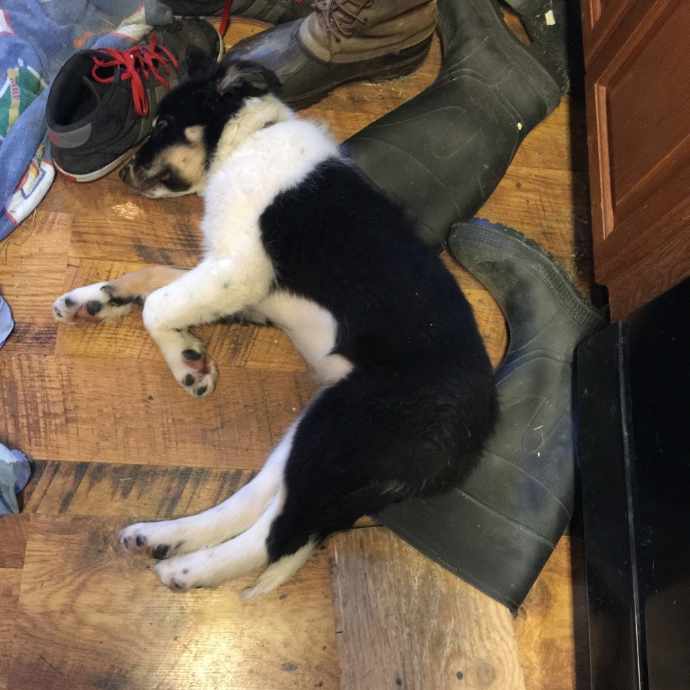 Flute joined our crew a couple weeks ago and is already entertaining us with his playful antics. Although he’s our resident class-clown we are impressed with how fast he learns new tasks and tricks. It will take some time to grow and refine his herding skills but we have no doubt he’ll be great. It will be nice to have a real herder since we make lousy border collies. Thank you Alpenglow Farm & Kennels for this wonderful boy.