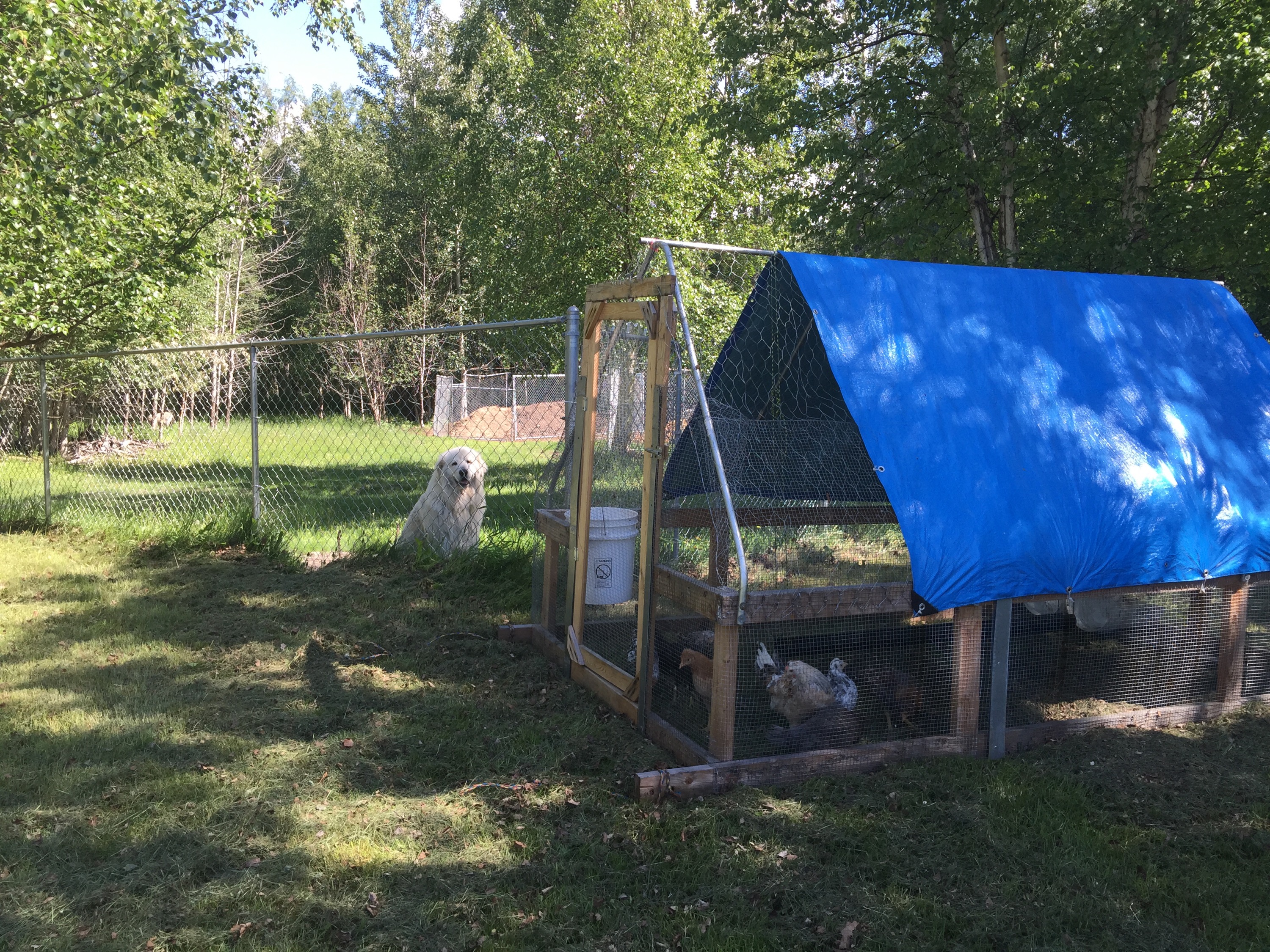 Since they are outside the pasture Al will stay by them and watch them through the fence. I pity anyone or anything that messes with his chickens, he’s only staying inside the fence because we ask him too.
