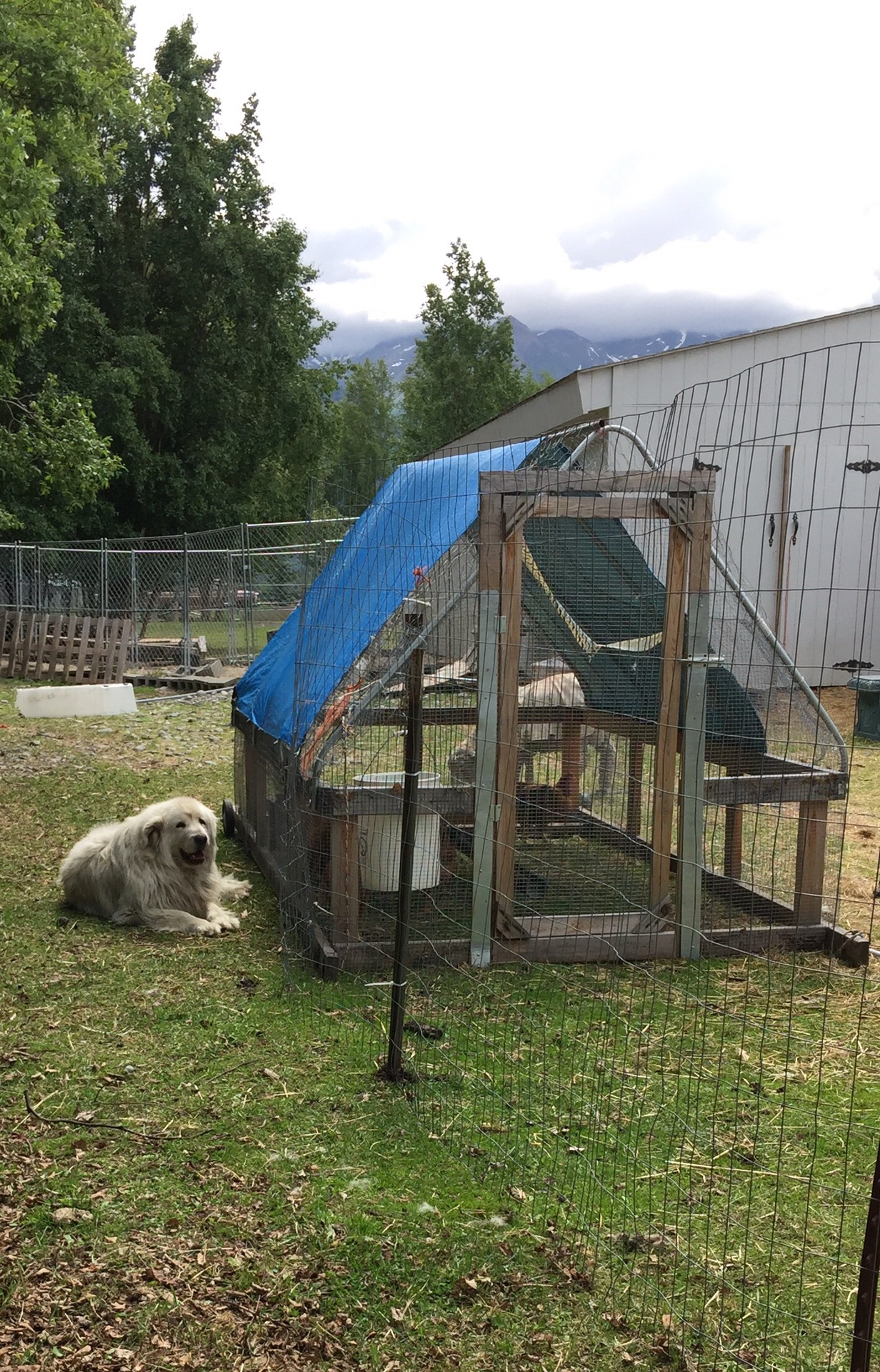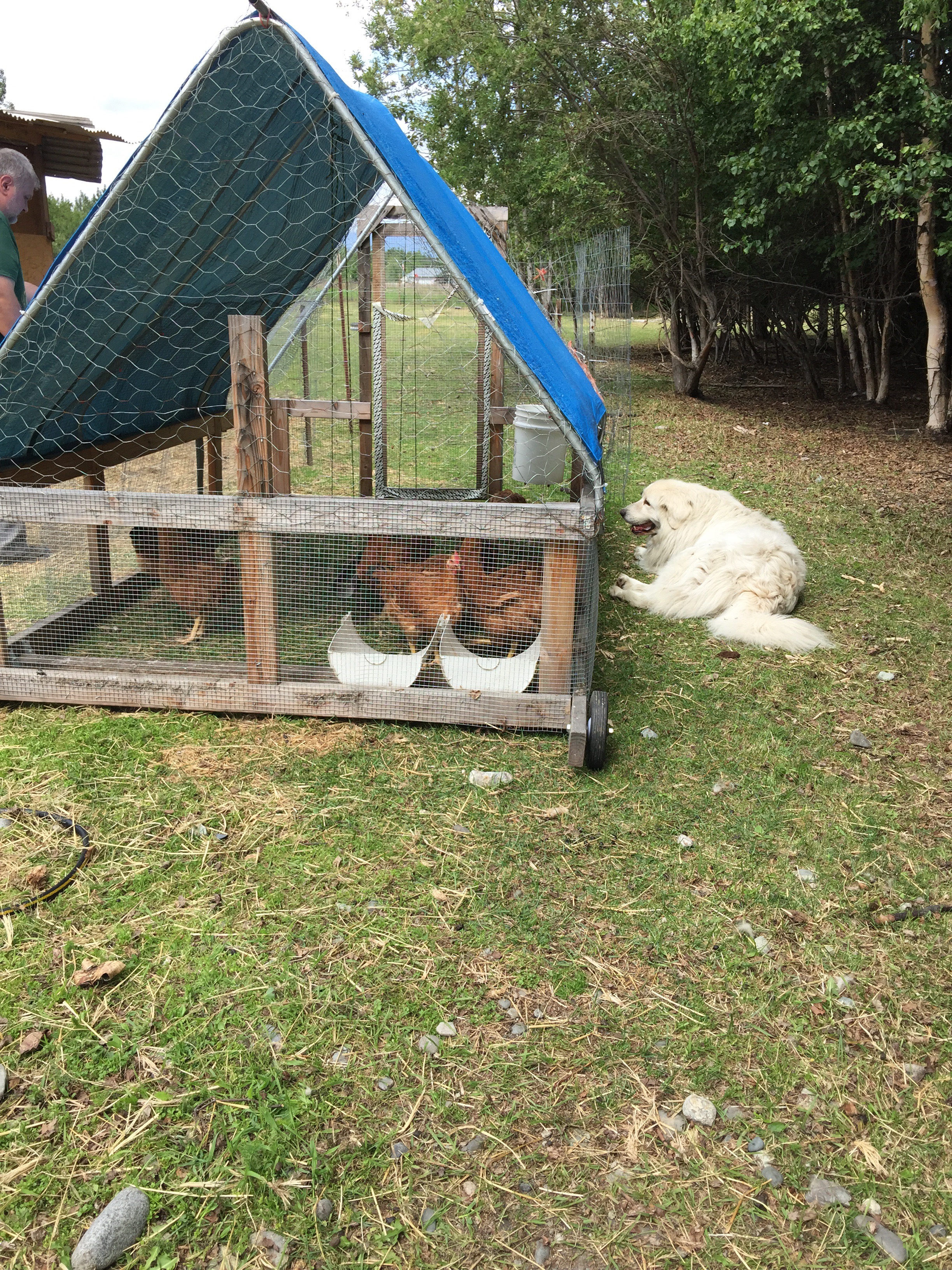 Mia and Anastasia hover around the sheep but Al, Al prefers the company of chickens. So much so that when we moved some meat birds to an outdoor pen he set up camp right next to them.