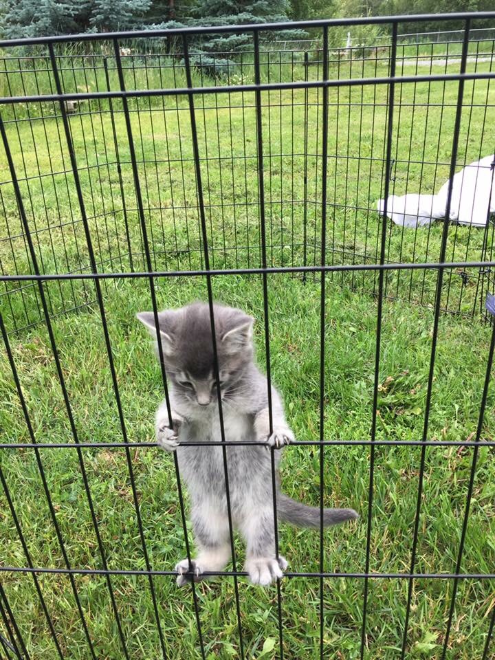 At a mere 6 or 7 weeks old he figured out (within minutes) how to scale this fence to follow me around. Then he went back in to get a toy and brought it out to play. He was a feral kitten who bit and clawed not because he was mean, but because he didn’t understand that’s not how you show affection. He’s still pretty sharp but now he pulls his claws in. Sometimes π