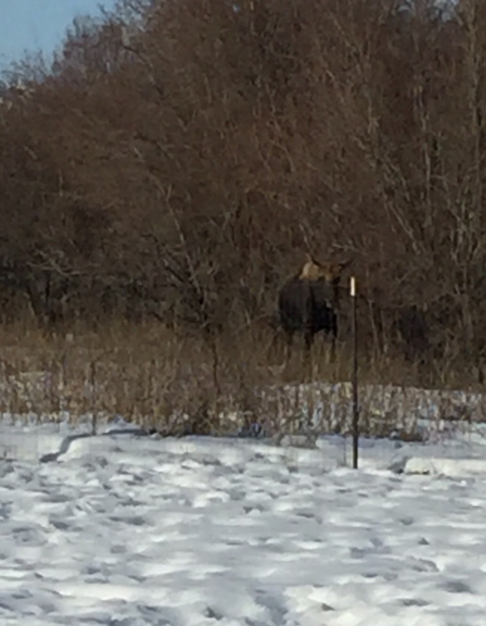 I know it’s hard to see but I only had my phone and I couldn’t get too close. This yearling moose is hanging around the field behind our pasture. Last night he was charging the fence, striking at the dogs. Tonight he just has cranky face.
