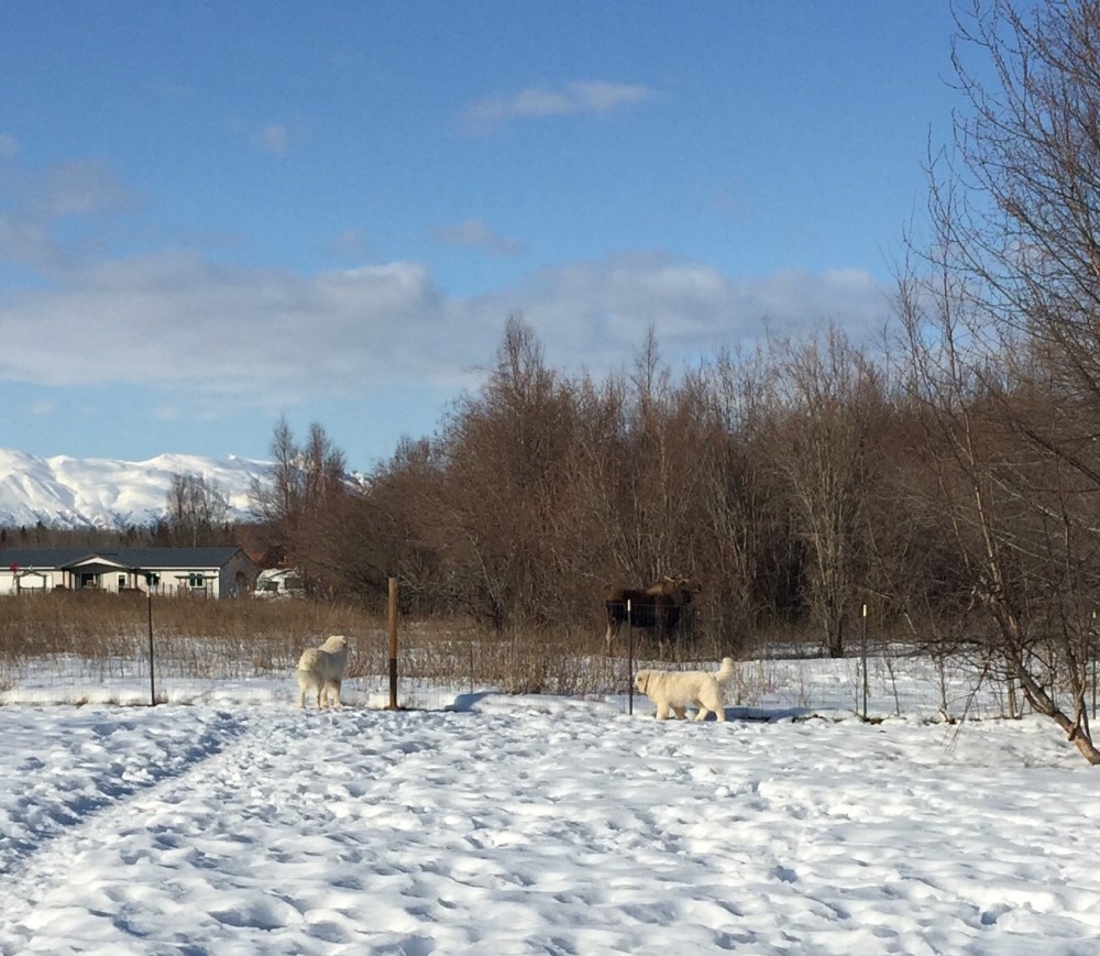 Last night the dogs actively engaged him and they raced up and down the fence line. Moosey was snorting and striking at them and the dogs were LOUD. I let them work for just a couple minutes then called them off to see what Moosey would do. He moved away when the pressure was off. If the dogs started in again he came back to charge and strike so I told them to “watch quietly” which they did. The quiet pressure kept him at bay better than chaos and commotion.