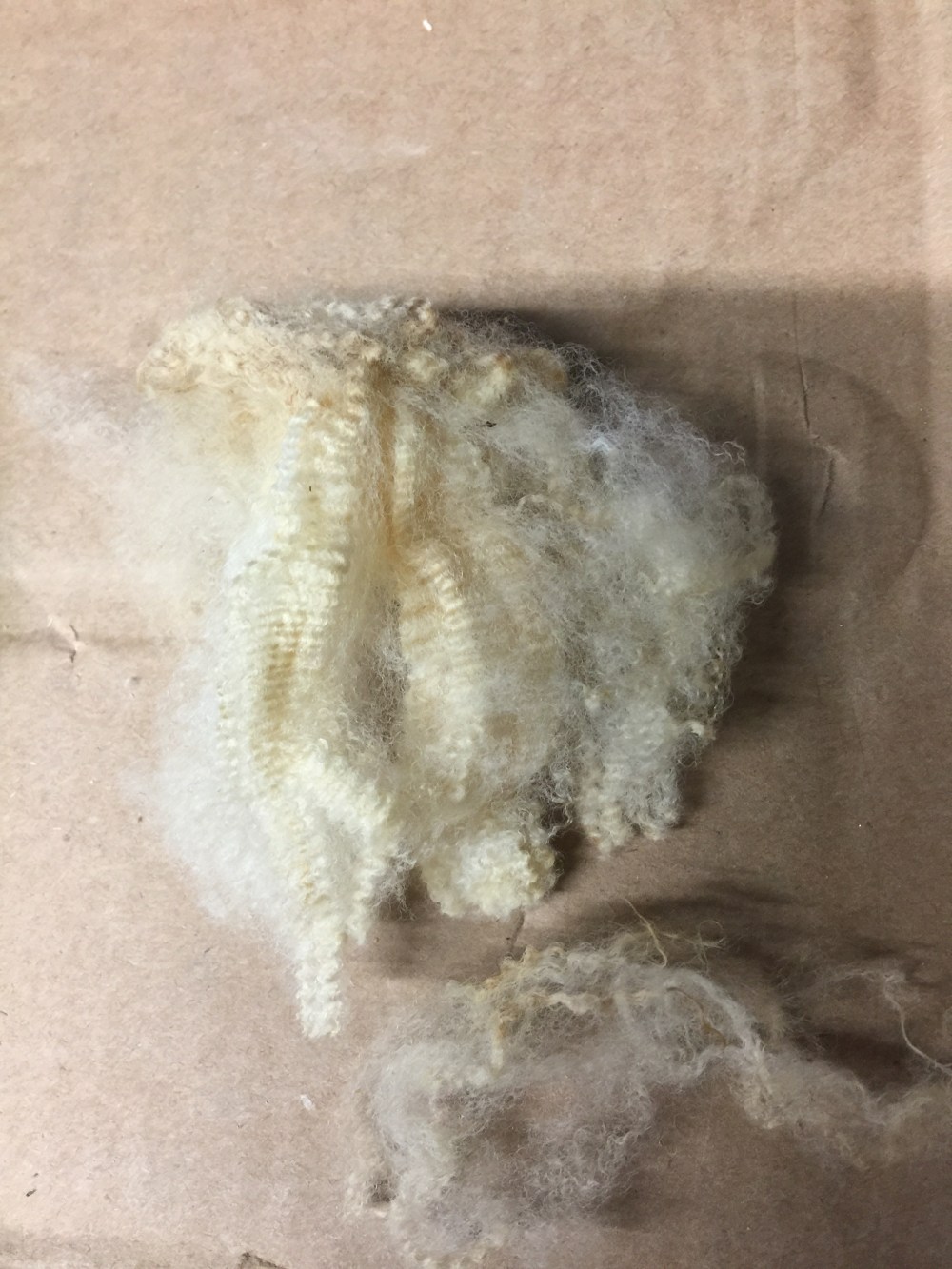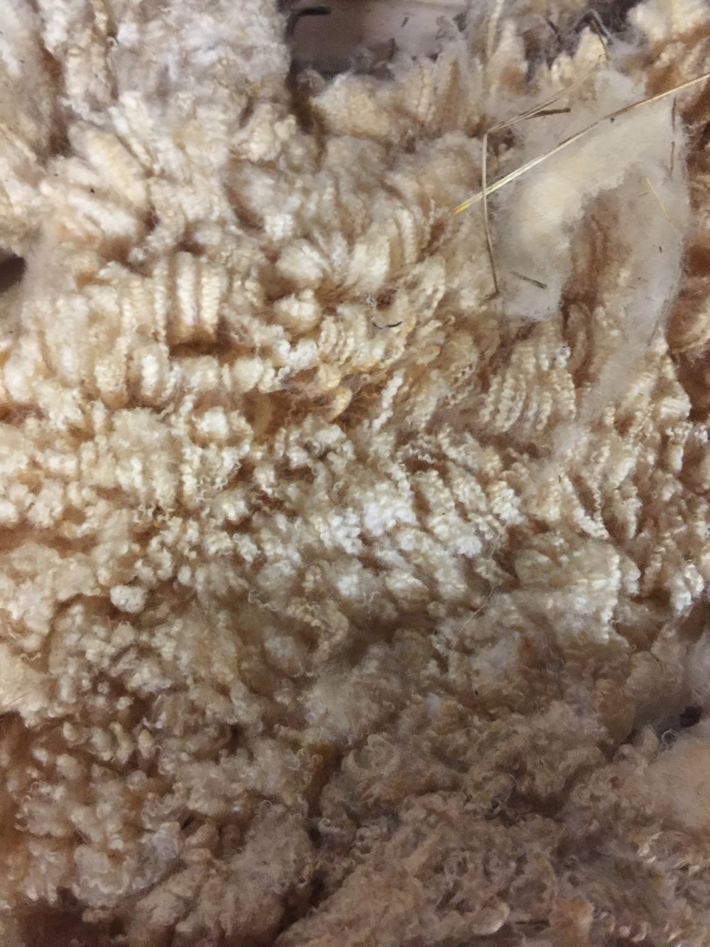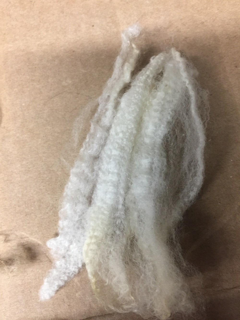 Duchess is a Columbia/Hampshire Down cross who was coated all year. This fleece is typical of a downy breed with wide open crimp and is a medium-fine grade. The staple length is over 3″ and it washes out nearly white. $50