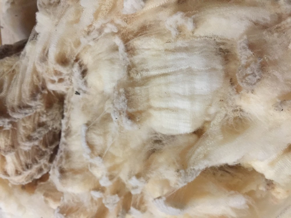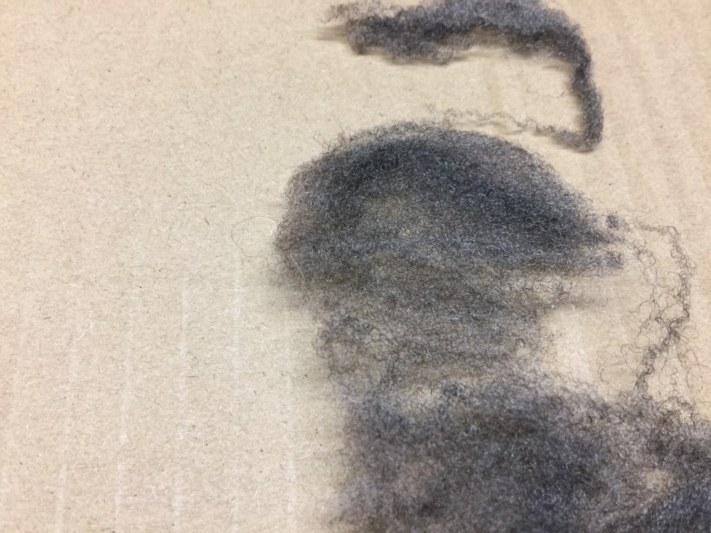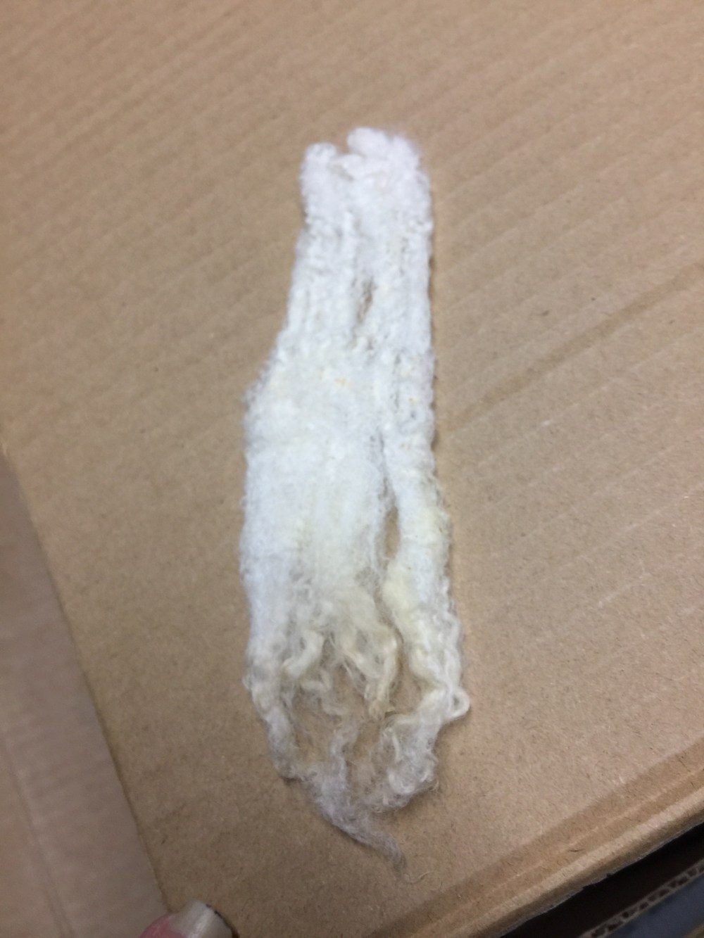 Duchess is a Columbia/Hampshire Down cross who was coated all year. This fleece is typical of a downy breed with wide open crimp and is a medium-fine grade. The staple length is over 3″ and it washes out nearly white. $50