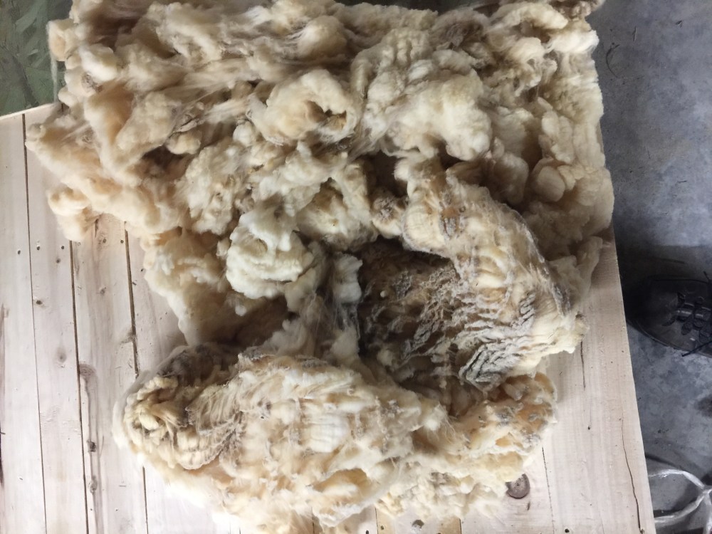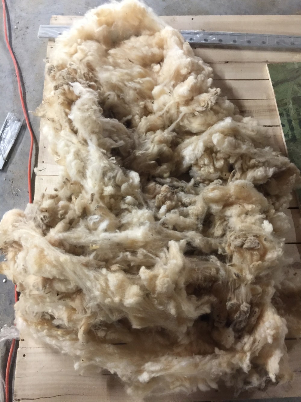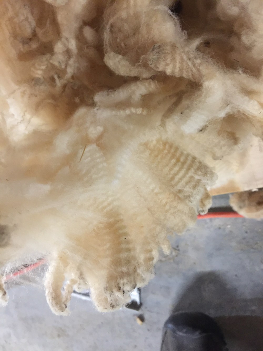 2 year old Rambouillet/Cormo wether. He was coated but this fleece got wet. It has a little musty smell but it washed out with just a bit of Dawn. Over 3″ staple, string and crimpy, washes out to a bright white. $30 for this fleece