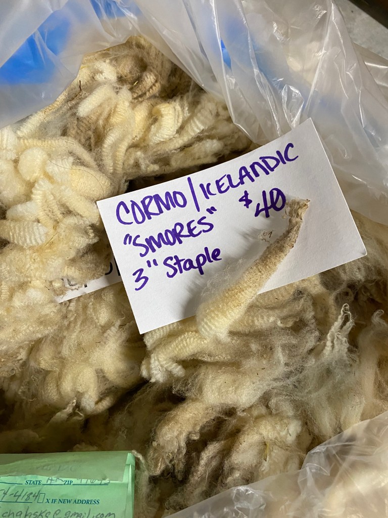 #5 – S’mores first fleece. It’s nice and soft, a smaller fleece that was coated and well skirted. Definitely more like the Cormo, just look at that crimp. Not much in the way of Icelandic guard hairs. 3” staple $40