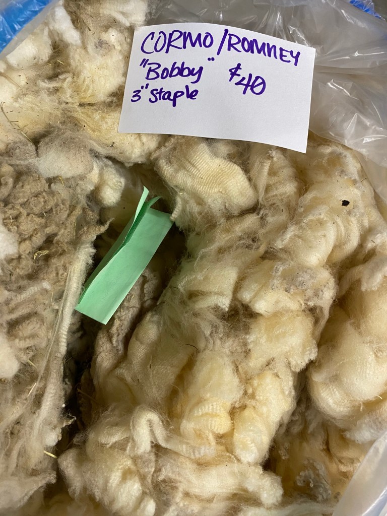 #12 – Bobby’s lamb fleece is what I would consider a medium sized fleece, he was coated and will wash out to a bright white. Cormo/Romney. 3” staple. $40