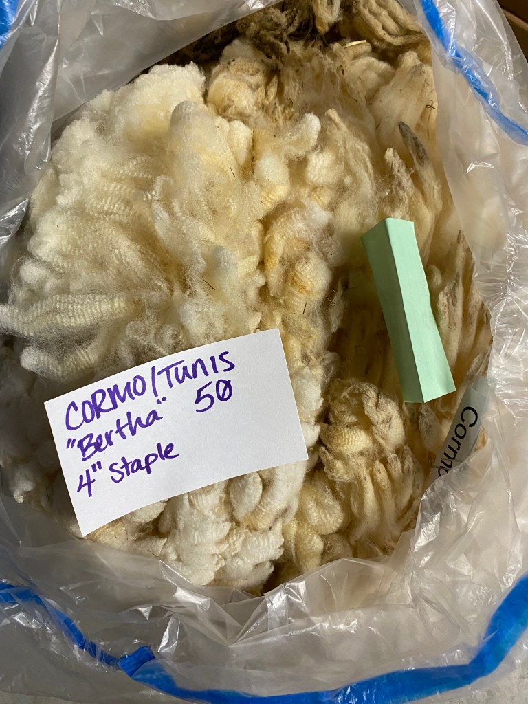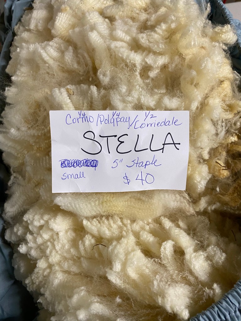 #43 – Stella Bella’s sister, Cormo/Polypay sired by a Corriedale Ram from New Zealand via AI. A nice fleece with Corriedale crimp and a 5” staple. $40