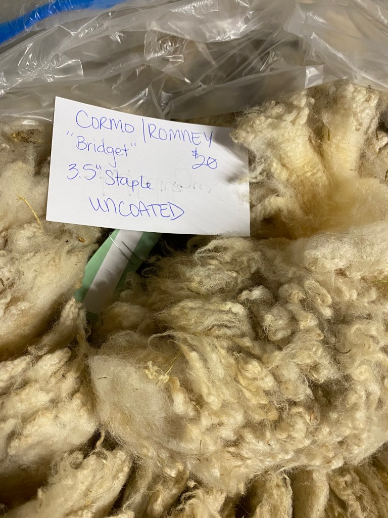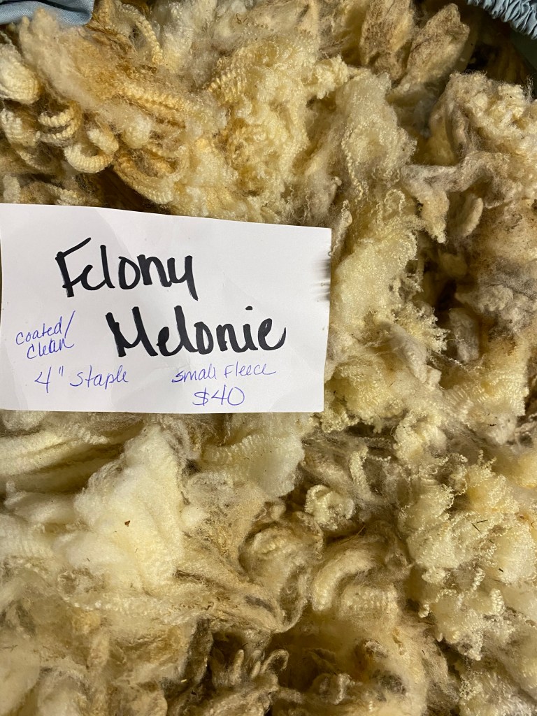 #36 – Felony Melanie A nice crimpy fleece with a 4” staple. She was coated so it’s clean and it’s been well skirted. Another Cormo cross that feels amazing. $40
