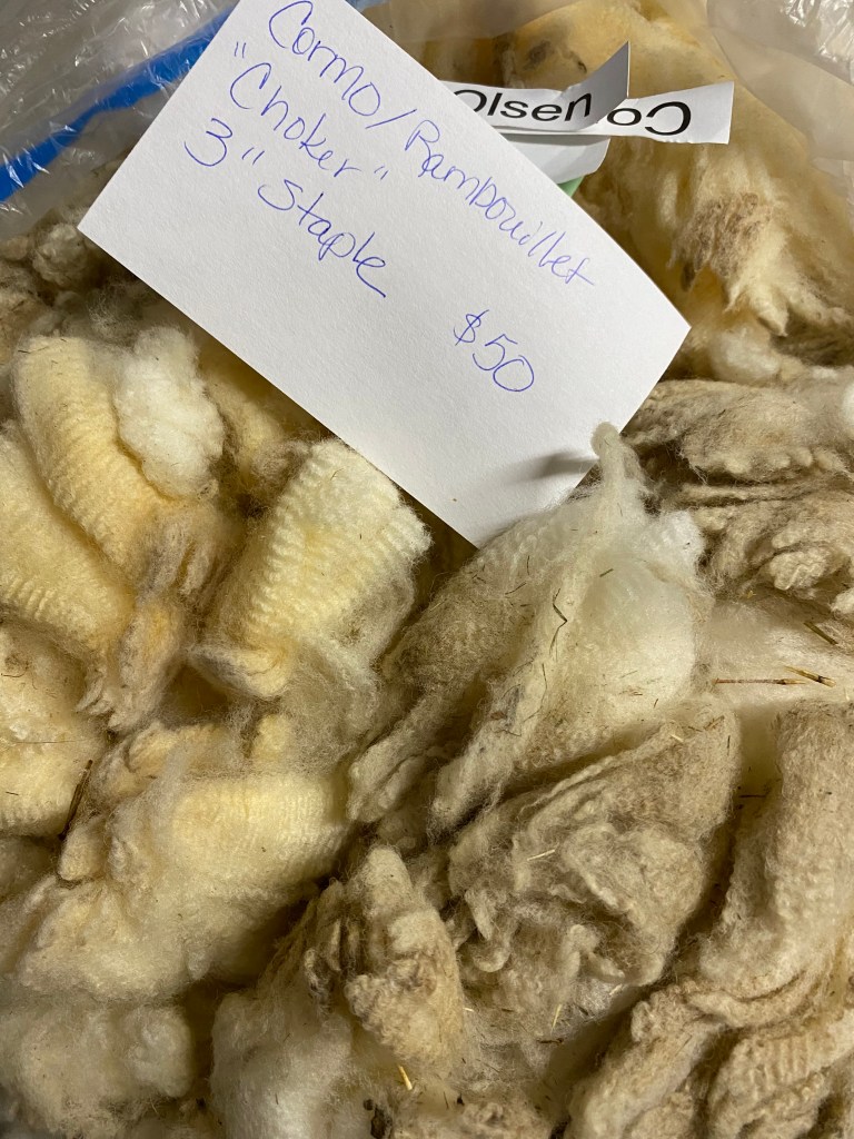 #4 – Choker is a delightful fleece. It’s big, it’s crimpy, and soft. He was coated and fairly well skirted. Cormo/Rambouillet 3” staple. $50