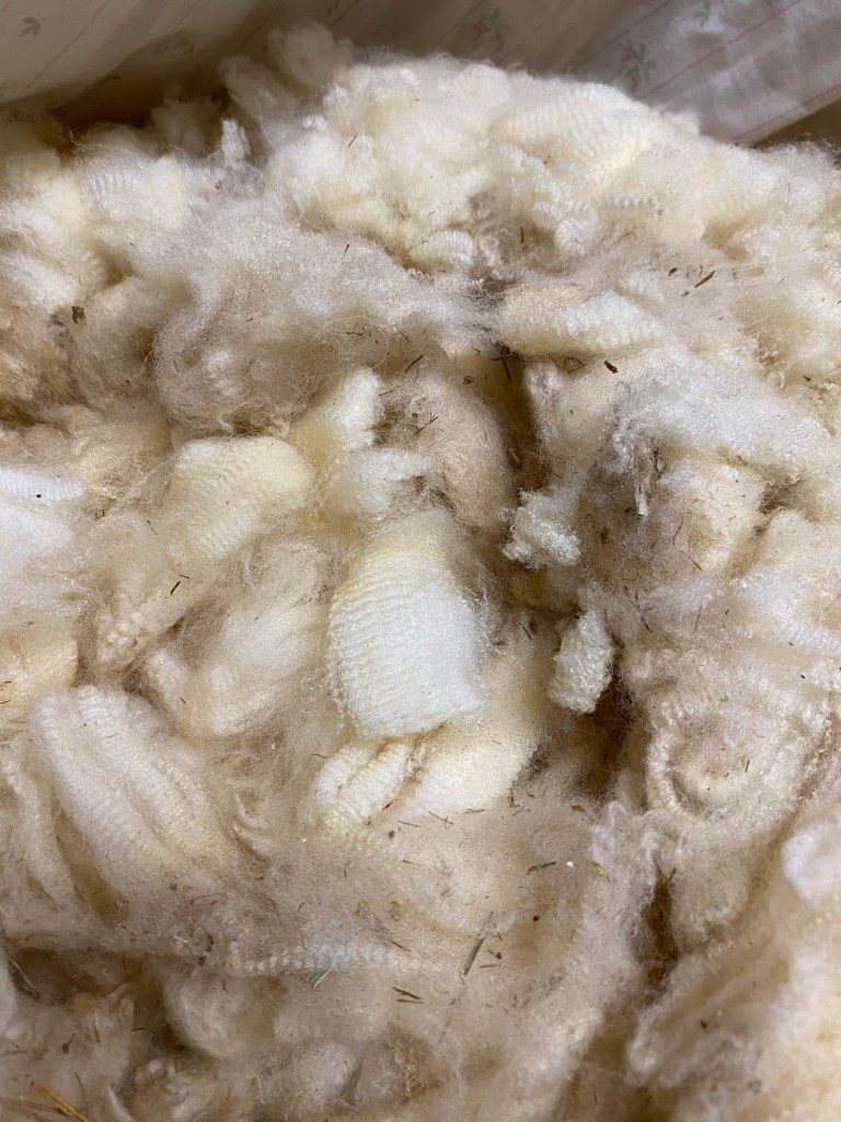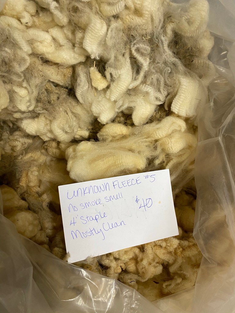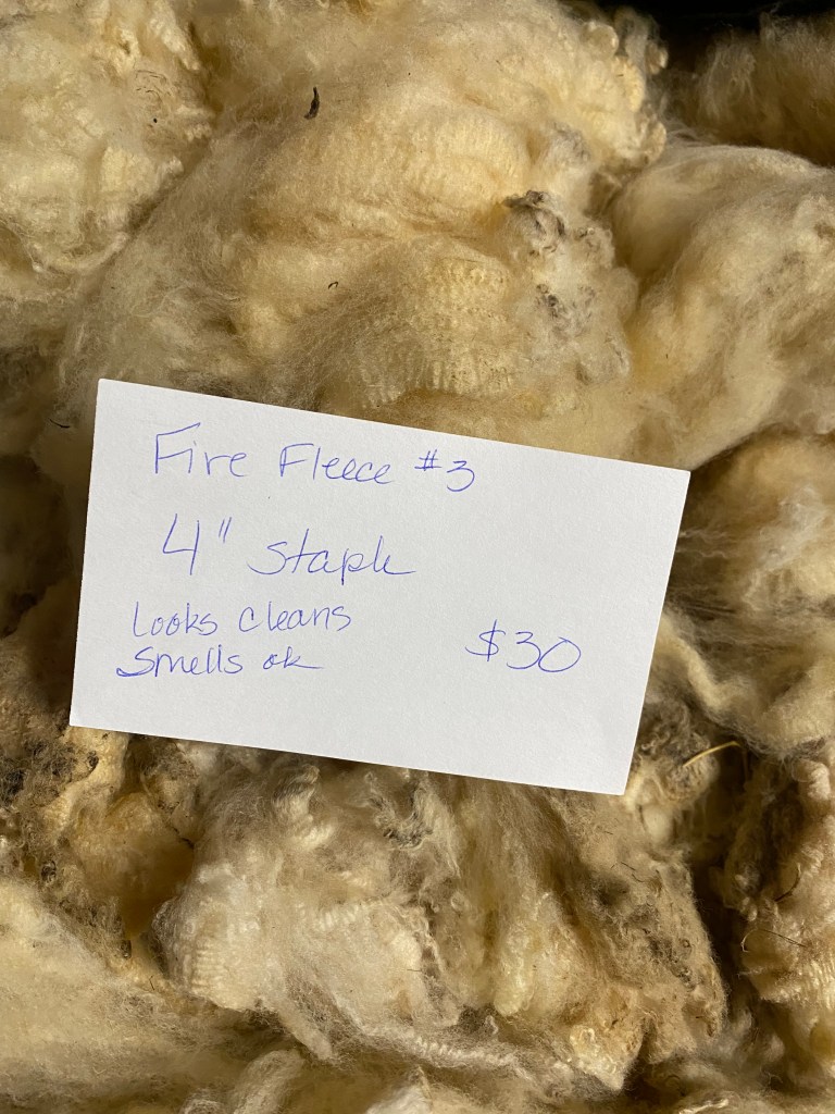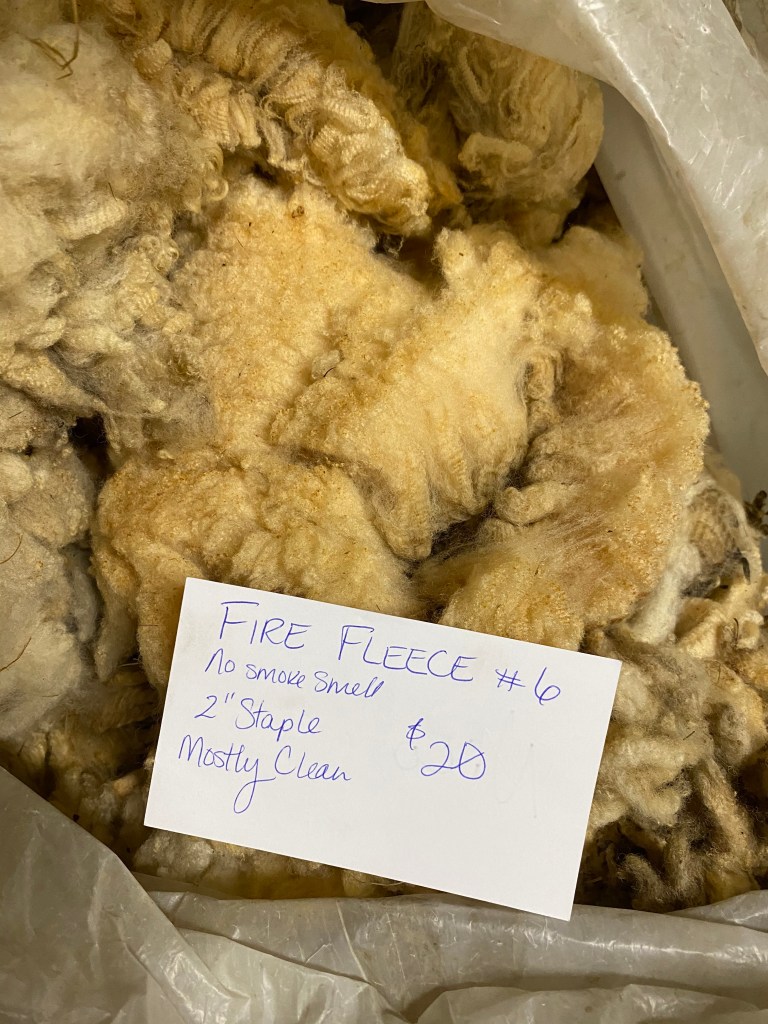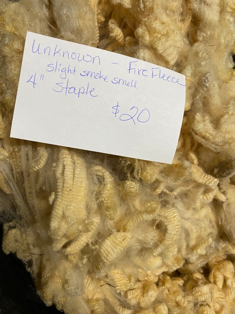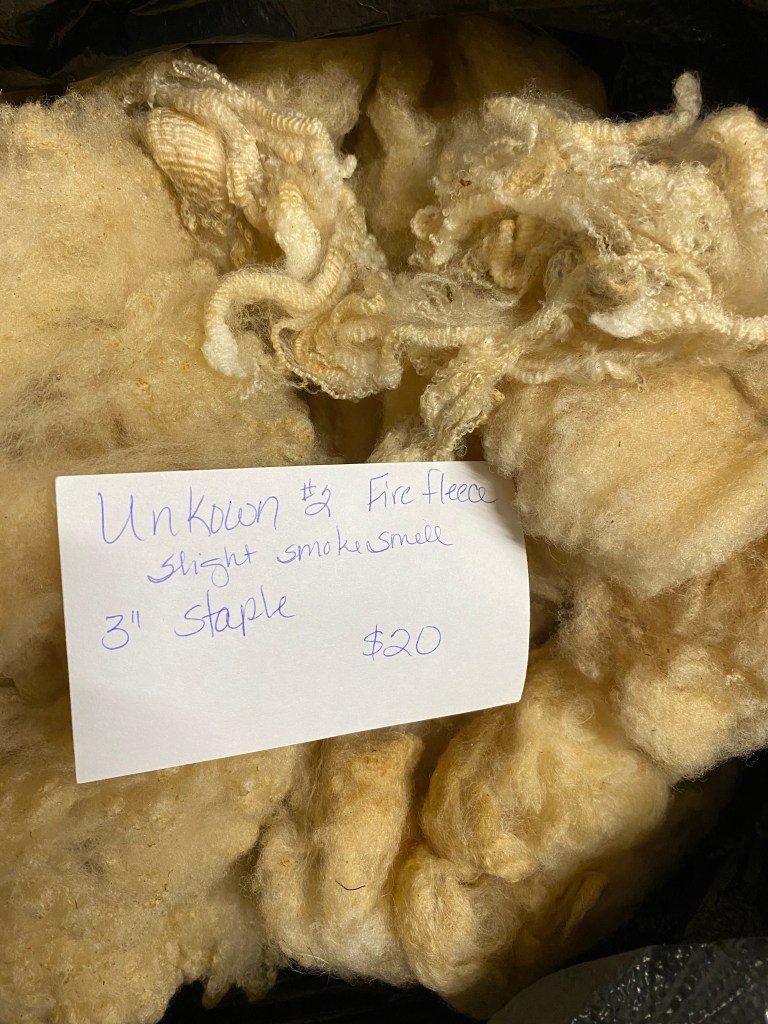 #6 – Unknown #5 This fleece was rescued from our house fire and does not smell smokey. it’s a pretty clean Cormo cross. 4” staple that still in lock formation. $40