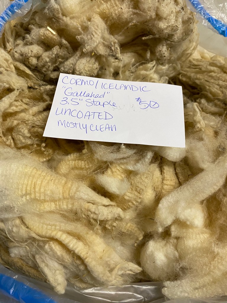 #7 – Galahad Icelandic/Cormo cross. This guy does not take a coat so there is vm but most is big enough to monkey pick out. Some guard hairs from the Icelandic side but mostly it’s Cormo crimpy goodness. 3.5” staple. $50
