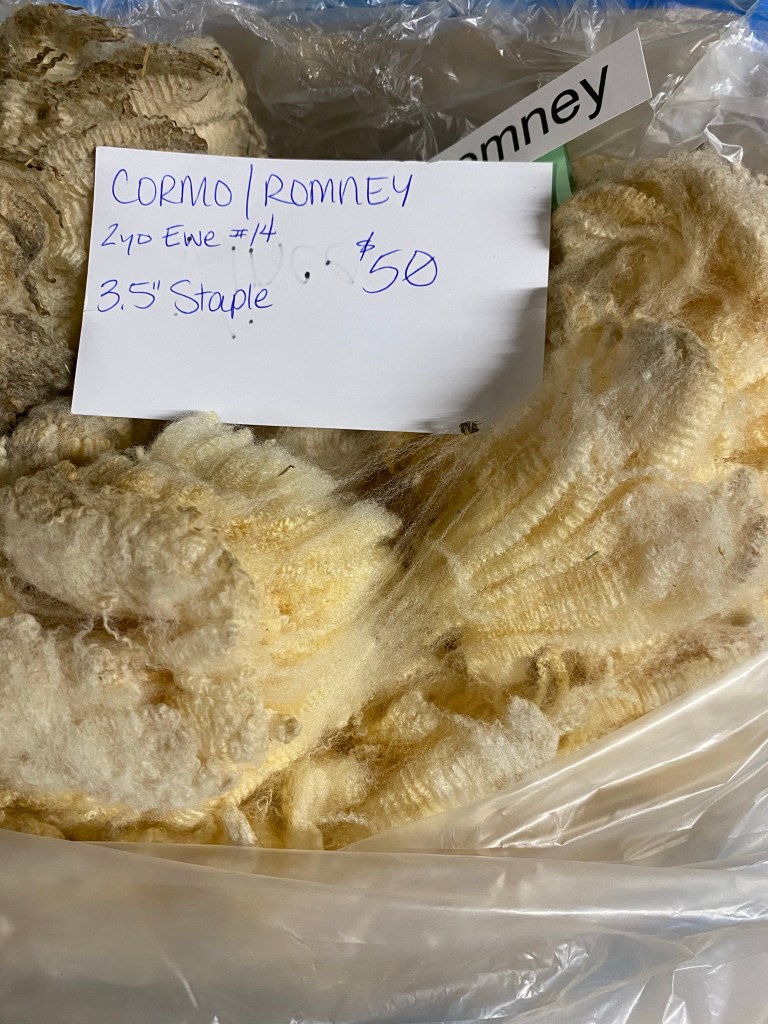 #14 – #14 Yes, you read that right. We had a sheep named #14. A nice sized fleece with good crimp. Another Cormo/Romney with 3.5” staple $50